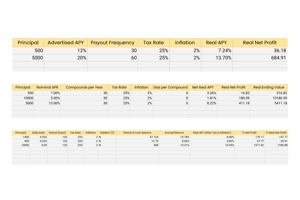 Instead of relying on the advertised APY you see on platforms, the tracker calculates what youβre actually earning. It factors in the things that quietly affect your returns, like taxes, inflation, compounding frequency, gas costs in DeFi, and how long your funds are being lent.